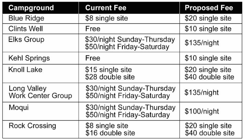 The following image displays the Forest Service's proposed fee changes for campgrounds in the Mogollon Rim Ranger District: