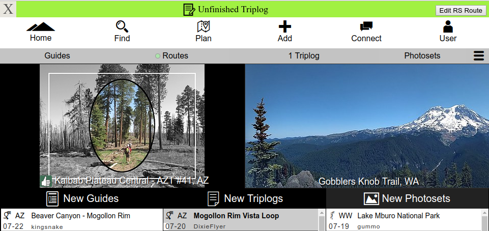 chumley wrote:Under the new RS, I can't save my recorded Saturday track anywhere until I've got my photos and triplog details all ready to go except if I start a triplog and leave it as an "unfinished triplog", which is the only way that I can also access and edit the route while I'm compiling the other things.