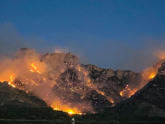 That's the good news, the bad news is that the fire is burning in the canyons behind Table Mountain over towards Buster Peak. The flames are high and very intense in Alamo Canyon and with the wind patterns we've had today the fire is heading towards Catalina State Park. If the fire doesn't reach the park, it will be a miracle. Saw a convoy of water trucks heading around 8:30 PM tonight.