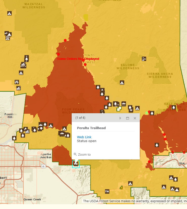 @AZLumberjack Peralta TH is open, but Peralta trail is closed. That appears to be the east boundary of the closure. The Bluff Springs and Dutchman trails are open.