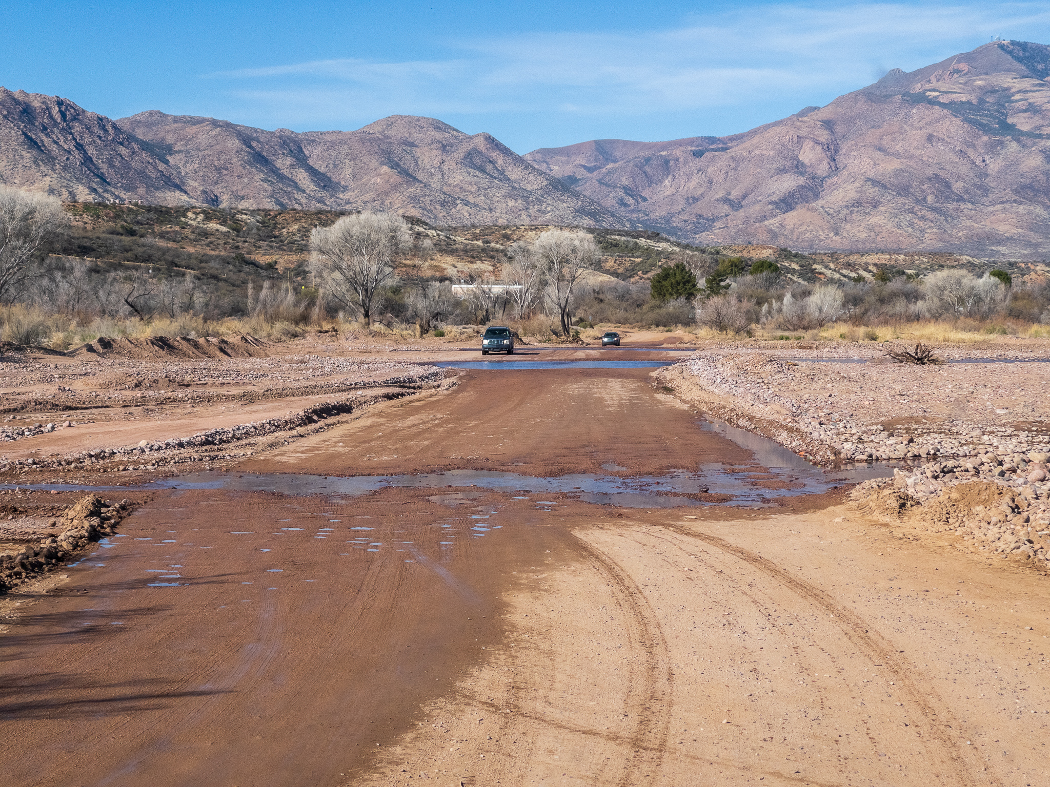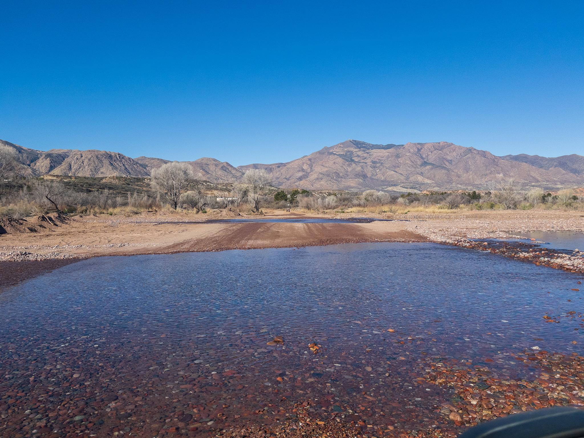 The Punkin Center crossing on FR71 was being rebuilt when we crossed it on 2022-01-27. A main flow was full of even grapefruit sized smooth rocks, with a little berm above to slow down flow and some heavy machinery was moving rock and dirt about. Was probably around calf-high clear water, spread around 4 crossings. At ~23cfm it wasn't that much, but in mid November at around 10cfm vehicles were lurching about and dropping to the tops of their tires etc and we bailed on trying it in a Subaru... so grading makes a difference! Had dropped to 19cfm when we crossed back Sunday and took the photo.