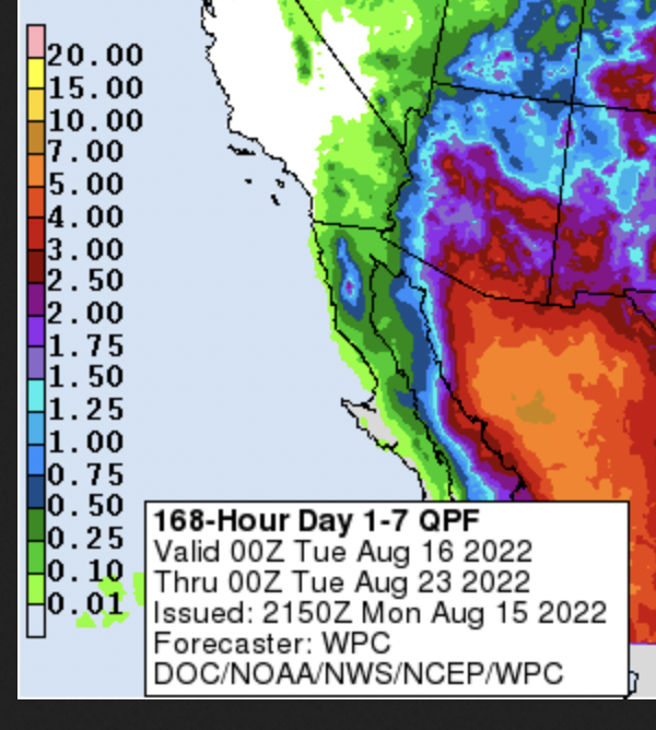 The people who get excited about such things are getting excited. If it doesn't actually happen, it's gonna put one of them in the hospital again like last week. For now, it looks like a surge of moisture will push into the state late this week and weekend. Current forecasts call for over 1.5" for about 2/3rds of the state with some large swaths of 2"-3" totals. Of course individual storms have the ability to produce higher amounts locally.