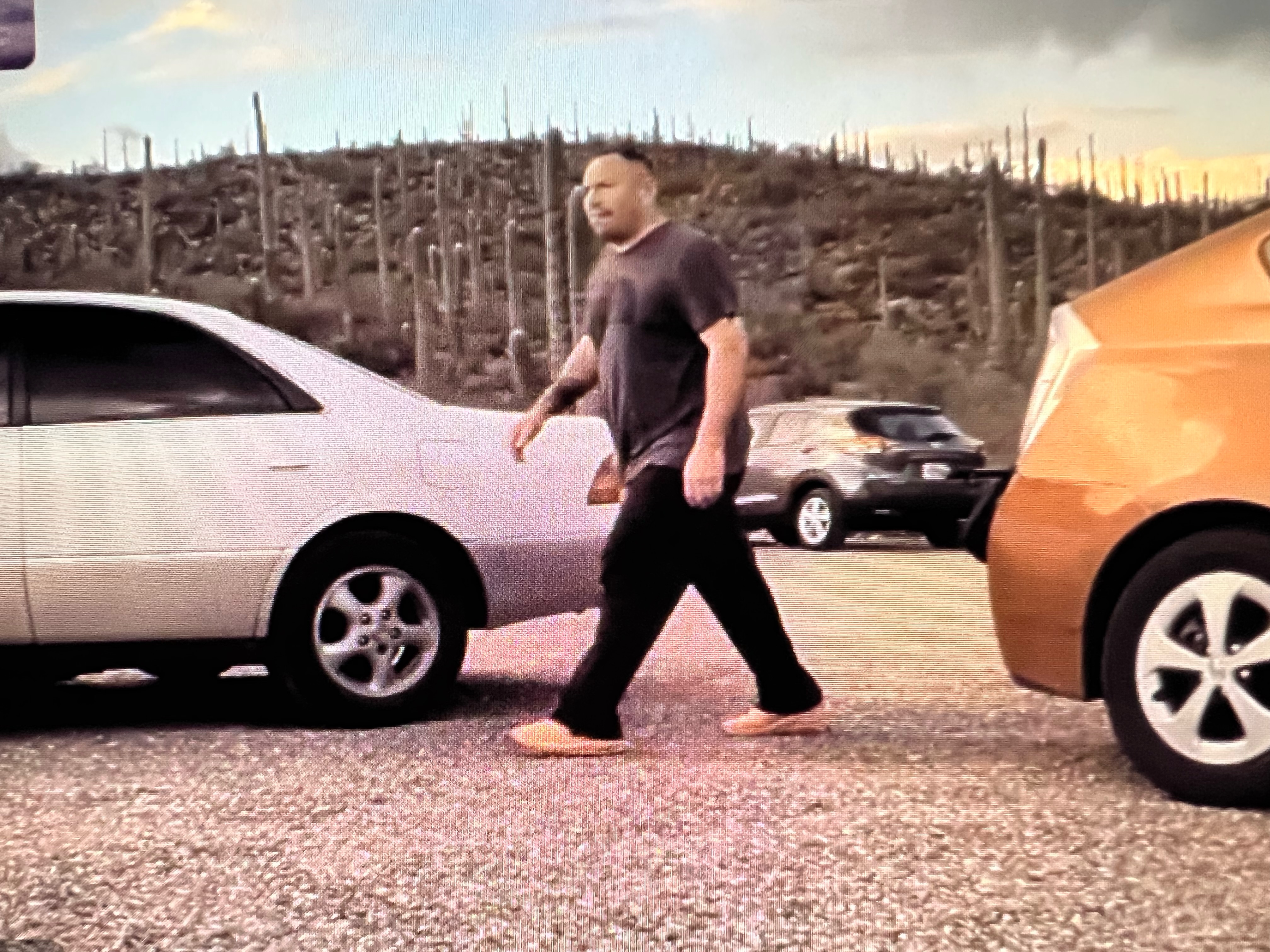 A man on a Harley style motor cycle was at the TH when I was, and I am very suspicious of him. He left right before me, hiking trail and and turned left at the first junction. He was alone, dressed in dark pants, dark shirt which I remember as long sleeved, and had a light beard, and sunglasses. He also had a military Camo-print back pack. For temps as hot as they were, he was not dressed the way I would expect. Marana PD may be able to pull Fry's and Sally security video, but the criminal had a mask on at Sallys. I am sure he did at Fry's.