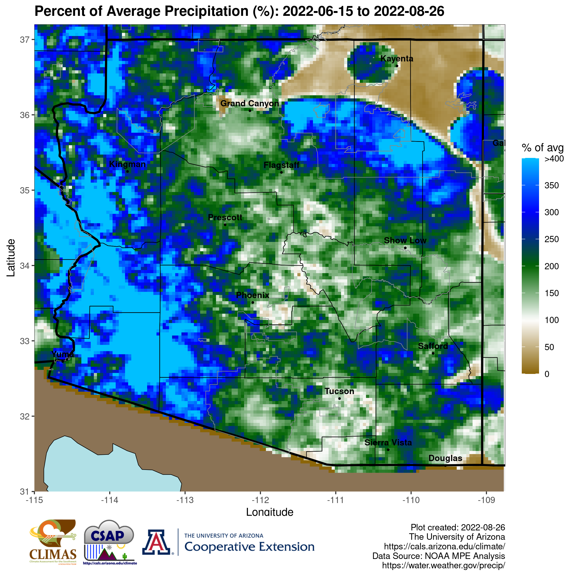 The statewide map shows very few pockets that are running below normal. I removed the color from everything above 125% of normal. Some pockets of the southeast valley, the crest of the Mazzies, a bit of the Mogollon Rim, and some dots south and east of Tucson are at or just slightly below normal for the season to date. I believe that the information in the northeast plateaus may be unreliable indicators as these are radar estimates and coverage there is sparse.