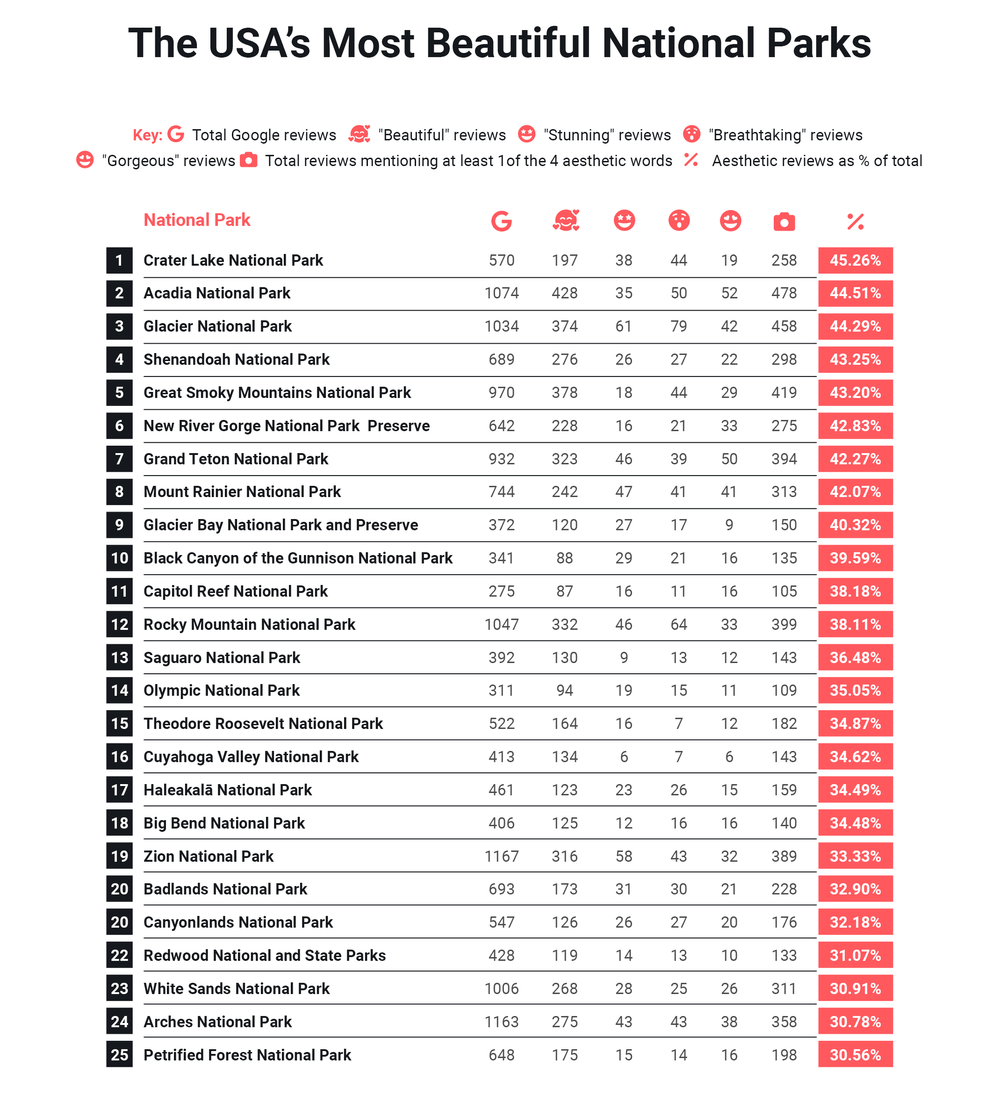 This is not a list of the most popular National Parks. It's a list of the most beautiful NPs, based on the % of the number of reviews containing the words ‘beautiful’, ‘stunning’, ‘breathtaking’ and 'gorgeous' for each park, as found on the www from travelers in 2023.