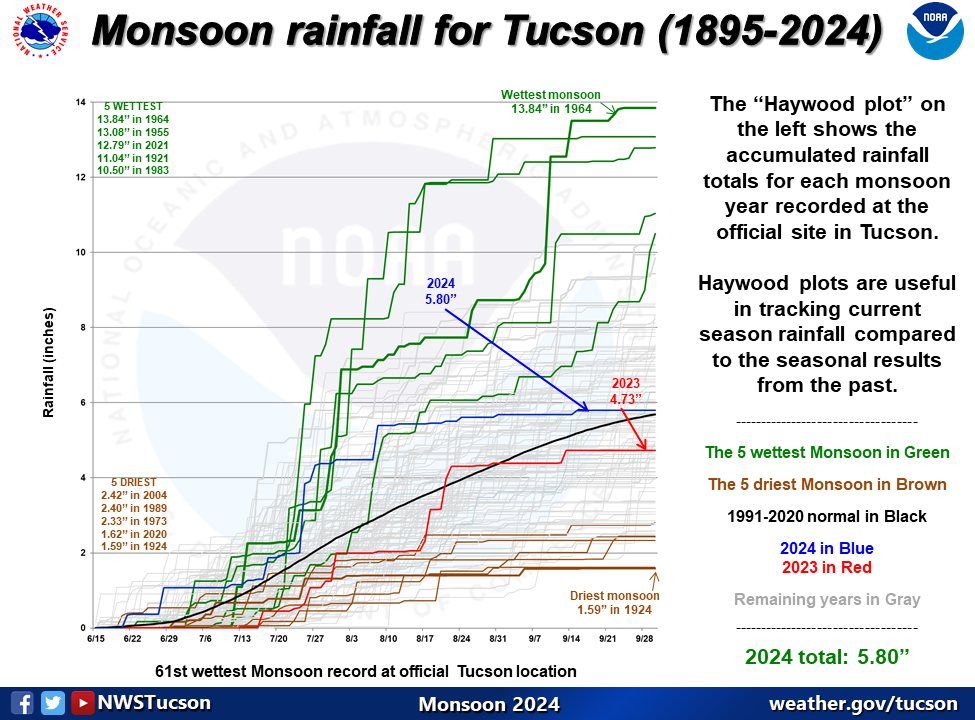 It started the summer around 12 inches, so about half of that came this summer. I don't know what the mean is for the station, but that is still pretty good both for summer and the year. Not 40 inches good as might fall on Mount Lemmon, but still good.