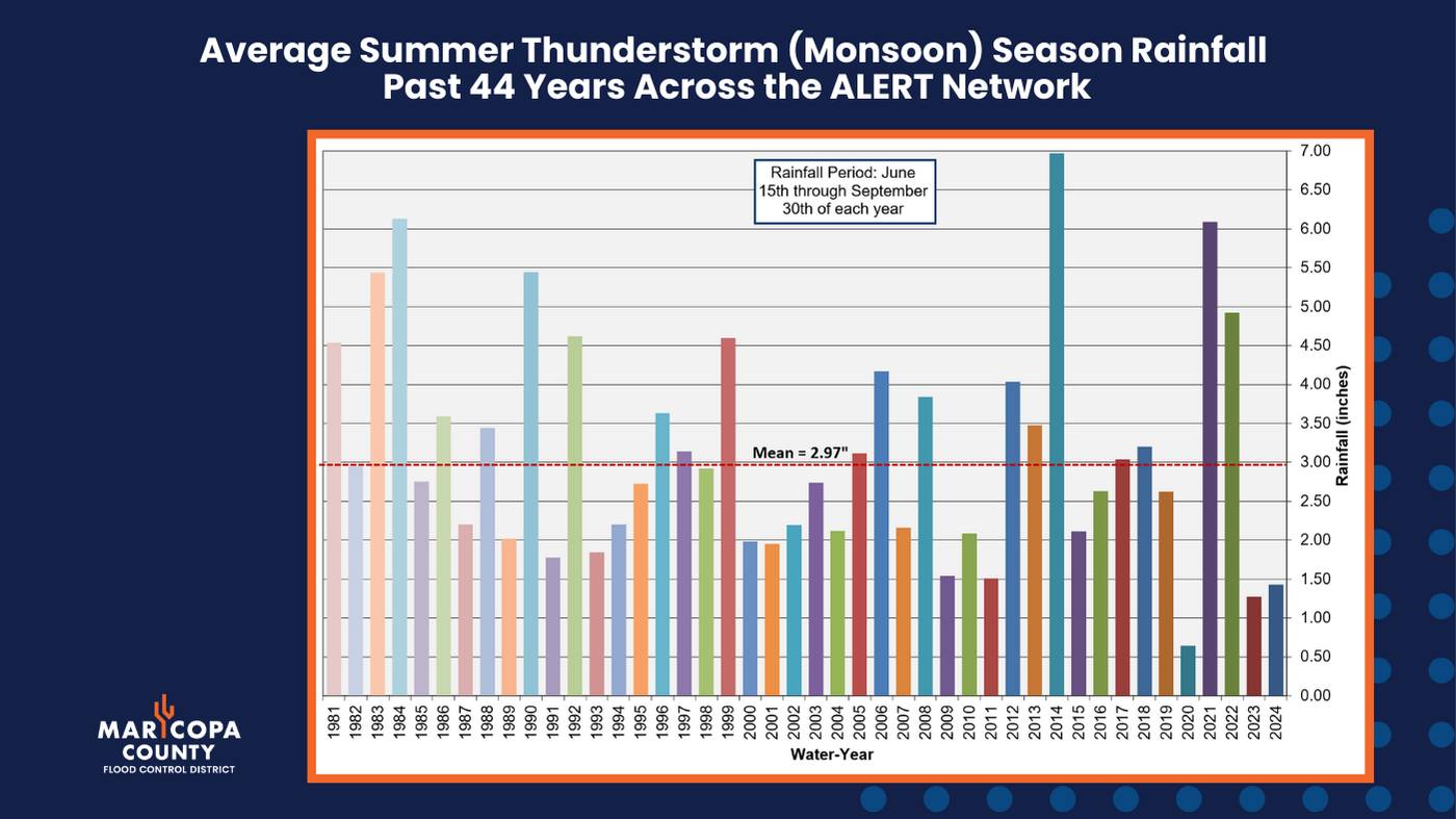 Monsoon rain totals are tough to track because of the highly variable amounts from one locale to another. What happens at the airport is not always a good indicator of what happened around the valley. This graph shows the average rainfall across all the gauges in the Maricopa County Flood Control District network. This average was nearly double the airport reading, but still well below the normal average of these gauges.