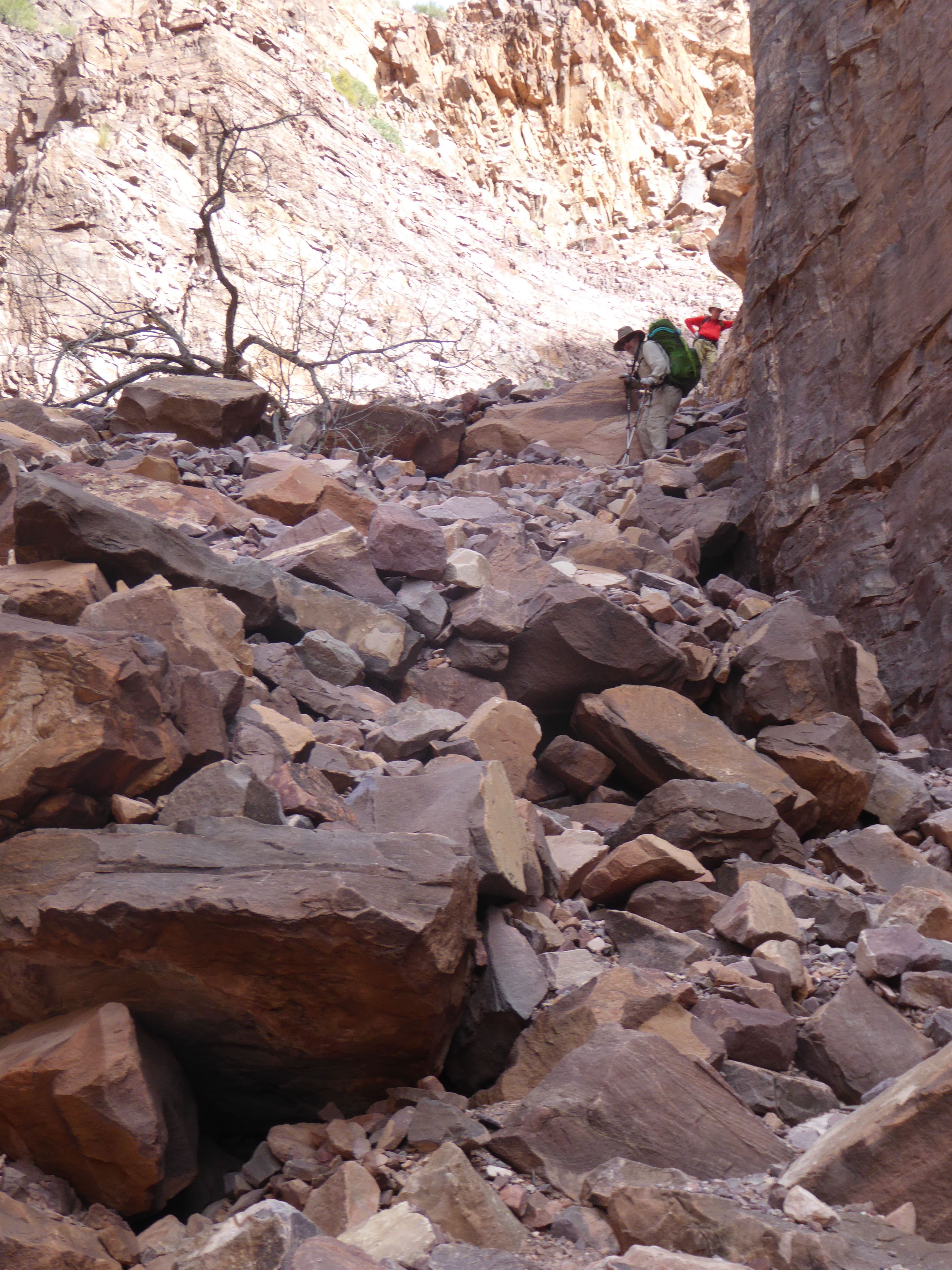 The slide area is just a gigantic pile of gravel. After you scale the wall, continue in a general down-river direction and follow the route that should be obvious from previous groups ahead of you. You will ascend slightly from the level of the top of the wall, gaining maybe 100 feet in elevation from the top of the wall to the top of the slide. You are maybe 200 feet above the level of the river at this point, but it has been many years and the slide may change from rain and additional minor landslides.