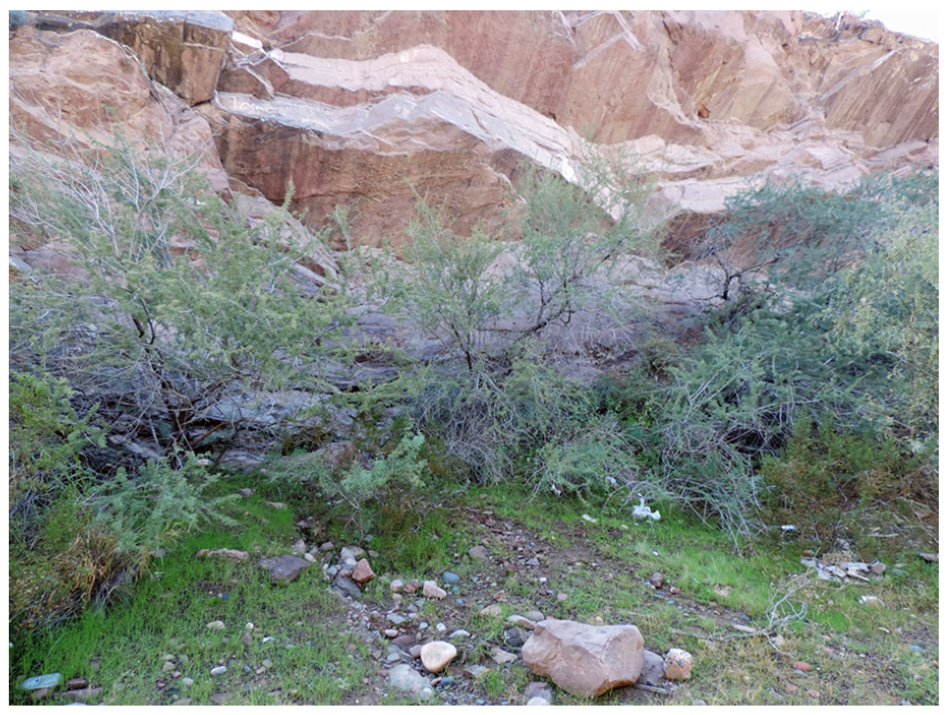 In Tempe, Arizona, two classic Western Message Petroglyph panels illustrate a second example where the geographic and historic contexts show a direct connection to the Mormon cultural sphere and routes of travel dating to the last quarter of the nineteenth century (Figure 10). The placement of two adjacent panels located on Hayden Butte are found in the riparian zone set low on a vertical sandstone wall located along a dry wash that drains to the nearby Salt River. Although not unique among WMP sites, the riparian setting (Figure 11 and Figure 12) is limited to a handful of examples6 that contrast with the lofty overlooks the majority of sites occupy.