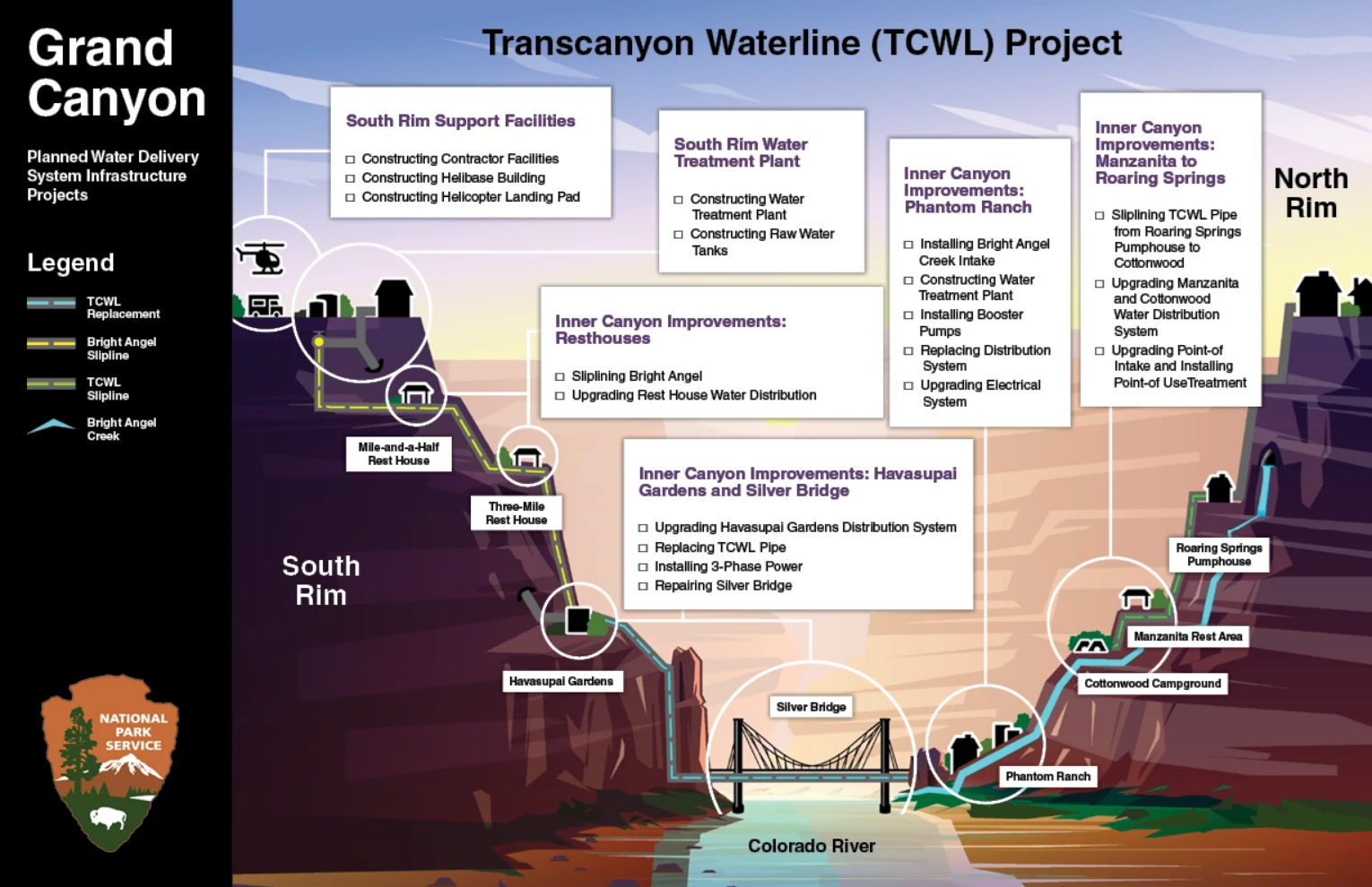 The TCWL project will relocate the water intake for the water delivery system to the South Rim from Roaring Springs to Bright Angel Creek near Phantom Ranch. This location will greatly reduce the length of the TCWL and eliminate a portion of the current waterline north of Phantom Ranch that experiences the most frequent failures. The water intake at Roaring Springs will continue to provide water to the North Rim.