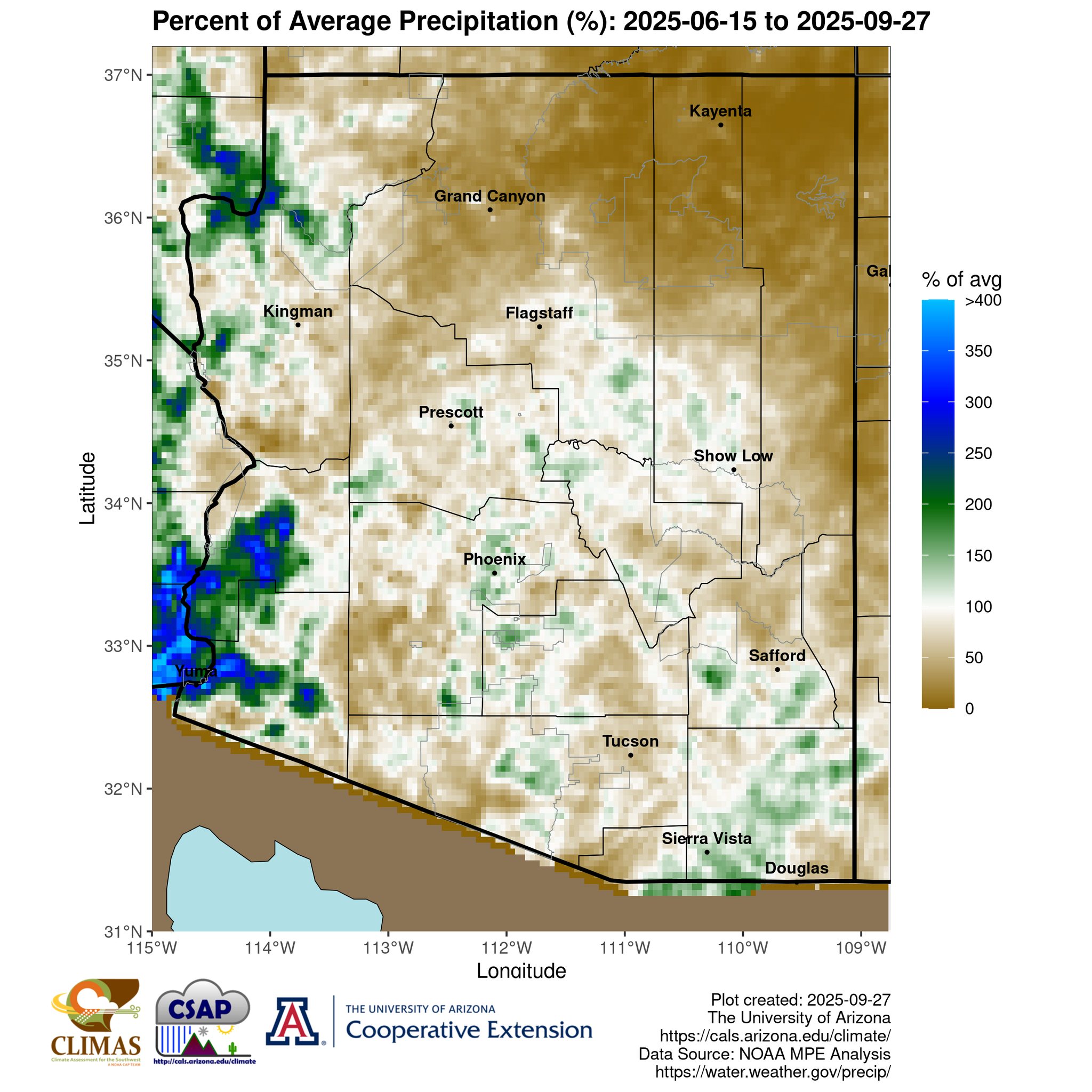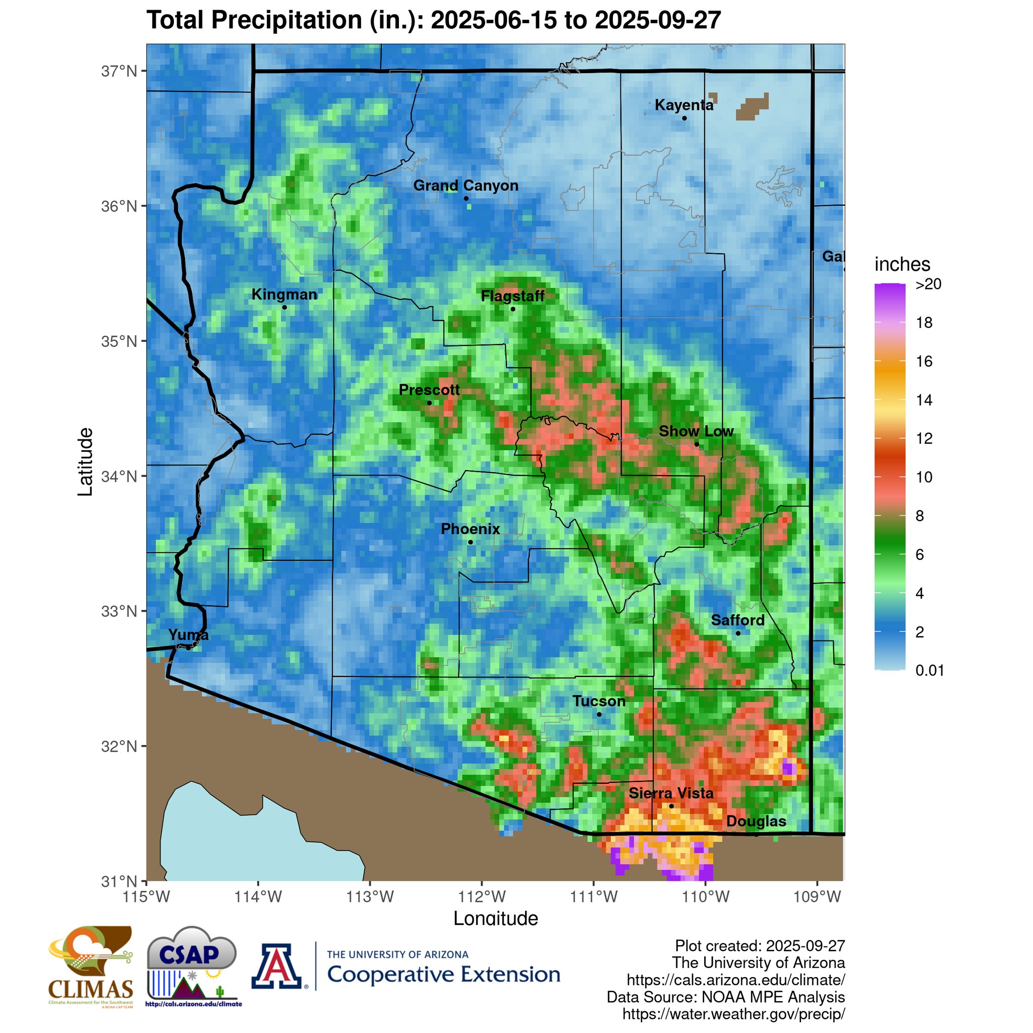 The deluge in the valley pushed the seasonal "monsoon" totals to mostly at or just above normal.