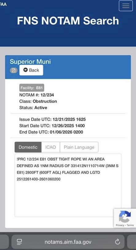 However, the only NOTAM which DID relate to the slack-line was issued for Superior Municipal Airport.