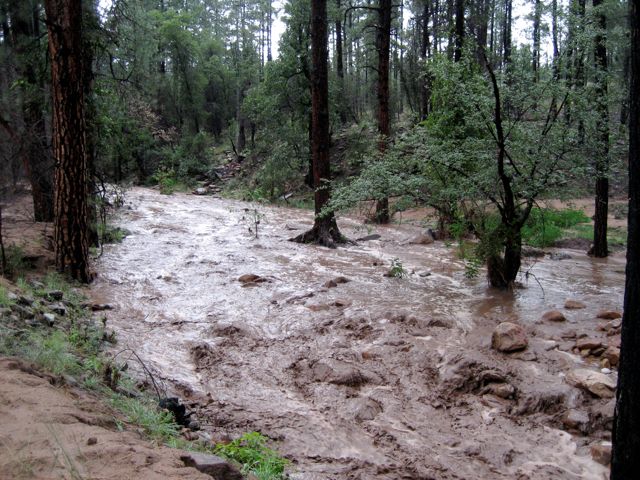 Though not really hiking related, I thought I'd share... I encountered a cool flash flood on Saturday afternoon north of Payson. These photos are from North Sycamore Creek at the junction of FR32 and FR64 (The Control Road). If you're somewhat familiar with the area, this is south of the Highline Trail, between the Geronimo and Washington Park trailheads. I was happy not to be hiking at the time I encountered two intense thunderstorms in under an hour, with numerous lightning strikes extremely close (near-instant deafening thunder) and unbelievably heavy rain. All enjoyed from the comfort of my truck!