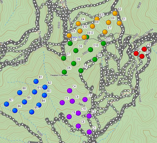 1. All search areas 2. B & C zoomed in 3. B & C zoomed in with possible changes to avoid previously searched areas 4. D, E & F zoomed in 5. D, E & F zoomed in with possible changes to avoid previously searched areas If these are helpful to you, I would recommend printing out at least #2 & #4, which are the zoomed maps with no edits. The as plans are shaped at the trail head any changes can be drawn in. Printing #1 can provide the overview of all the areas.