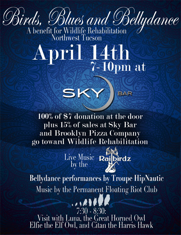 On May 7th from 7-10 pm I am hosting a benefit at Sky Bar- 536 N. 4th Avenue, Tucson- for Wildlife Rehabilitation Northwest Tucson, where I am a volunteer. 100% of the $7 donation at the door, plus 15% of sales at Sky Bar and Brooklyn Pizza Company go toward the rehab. Luna the Great Horned Owl, Citan the Harris Hawk, and Elfie the Elf Owl will be at the event from 7:30 to 8:30 pm. Come out and have a pizza and a beer and enjoy live blues by the Railbirdz and bellydance performances while supporting a great facility that helps hundreds of birds and small mammals yearly! Click the picture below for the details: