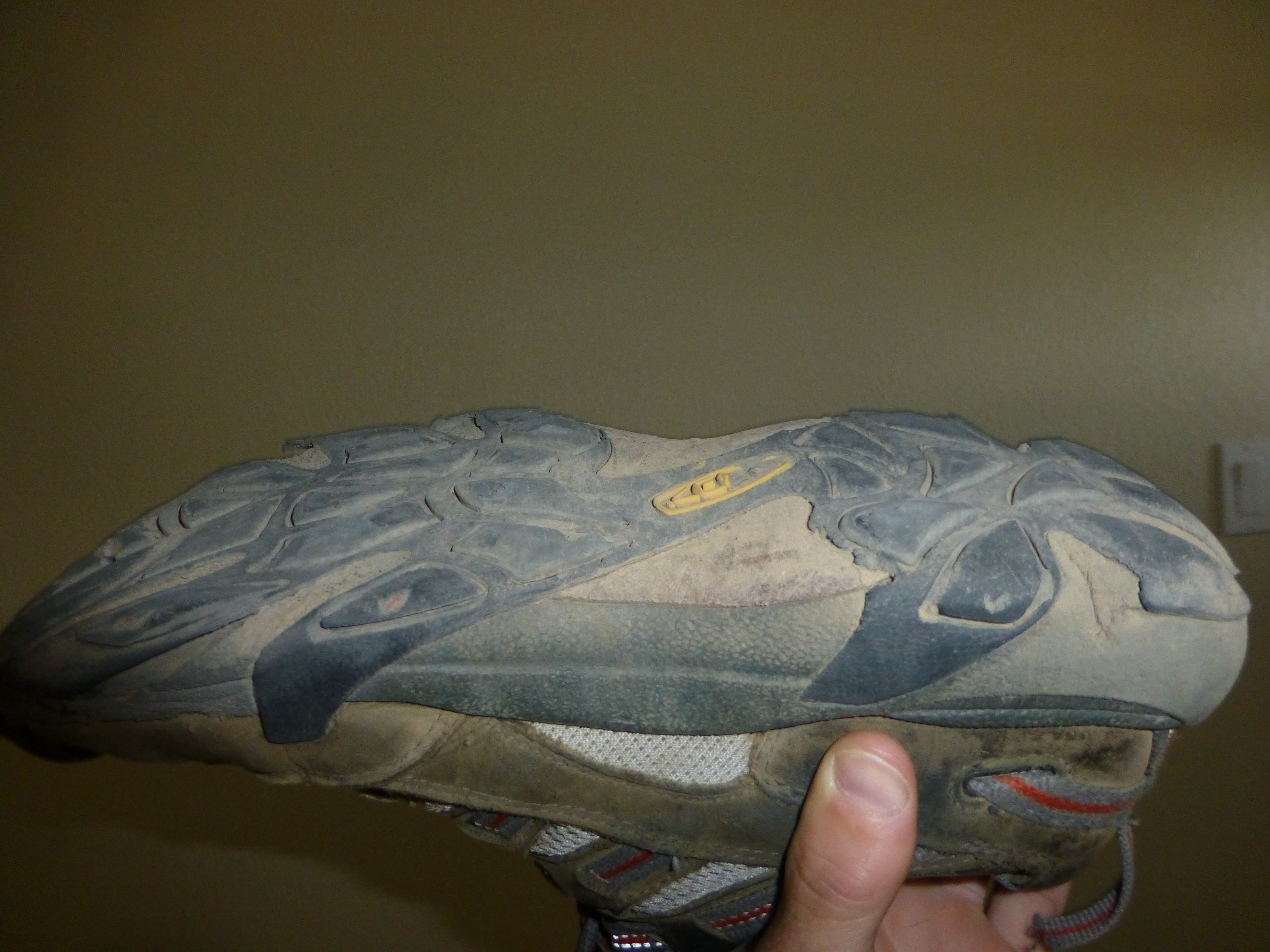 A couple of photos of my first pair of keen's that have been through months of abuse. I bought them using a gift card and so maybe $30 out of pocket, I don't remember. I've been really happy with them. They are now finally on their last stretch and breaking down and losing a little chunk here and there, and I don't wear them on major hikes. However, for my quick Camelback/Papago workouts they're still performing nicely. There's a little slide rock spot on Echo Canyon where I always test them for grip, and today they were still good. Today I bounced down the Cholla trail with total confidence in them. I think I'll get a few more good runs out of them.