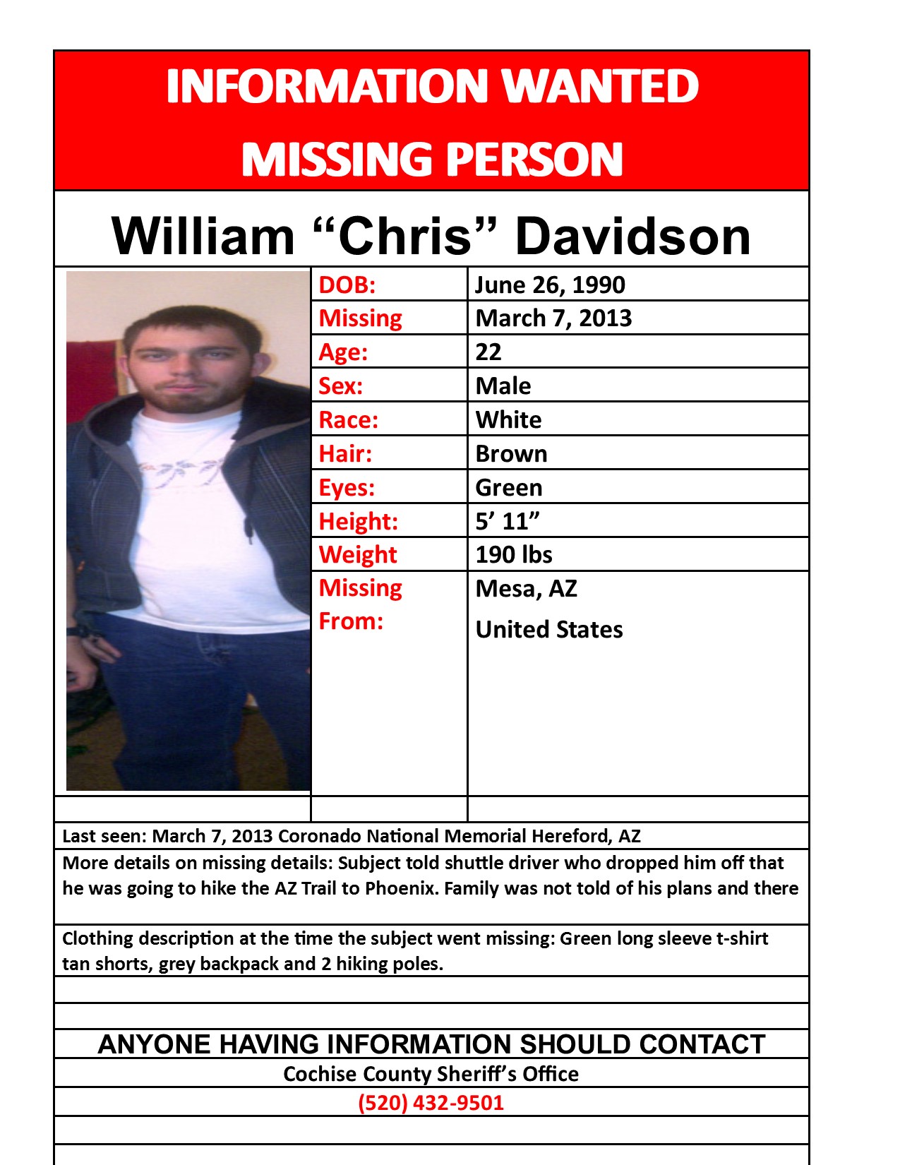 The Cochise County Sheriff's Office is requesting assistance in locating a subject who was dropped in Montezuma Pass on March 5th and has not been seen or heard from since. His name is William C Davidson, he goes by Chris and he is 22 years old. His family said that he has a silver or grey backpack. They also said that as far as they knew he did not make any arraignment for re-supply and I confirmed with the Patagonia Post Office that he did not get or send anything. If you have any info on Chris contact the dispatch center at (520) 432-9501.