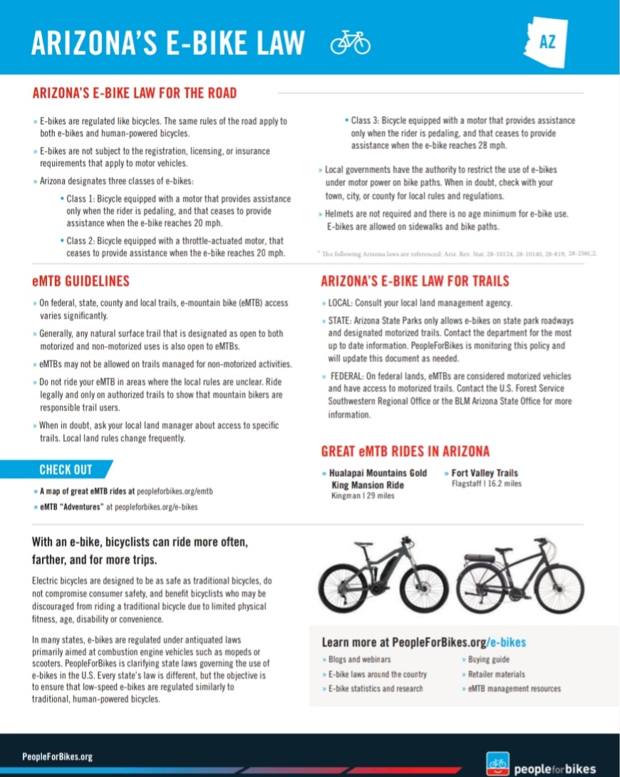 Actually under Arizona law, a class 1 or 2 ebike is the same as a regular bike - it is not considered a "motor vehicle" ... they are allowed wherever boring bikes are, UNLESS an area is specifically posted "no ebikes".