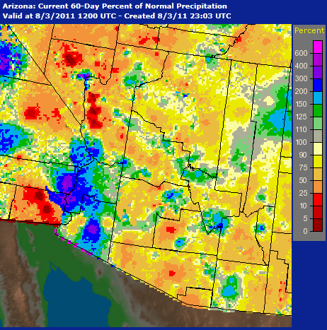 chumley wrote:The Phoenix Rainfall Index is showing that overall, the valley as a whole is experiencing a perfectly normal monsoon, with .65" of rain so far (normal is .66). But with the exception of a few isolated pockets, most of Arizona is experiencing a dryer-than-normal season so far.