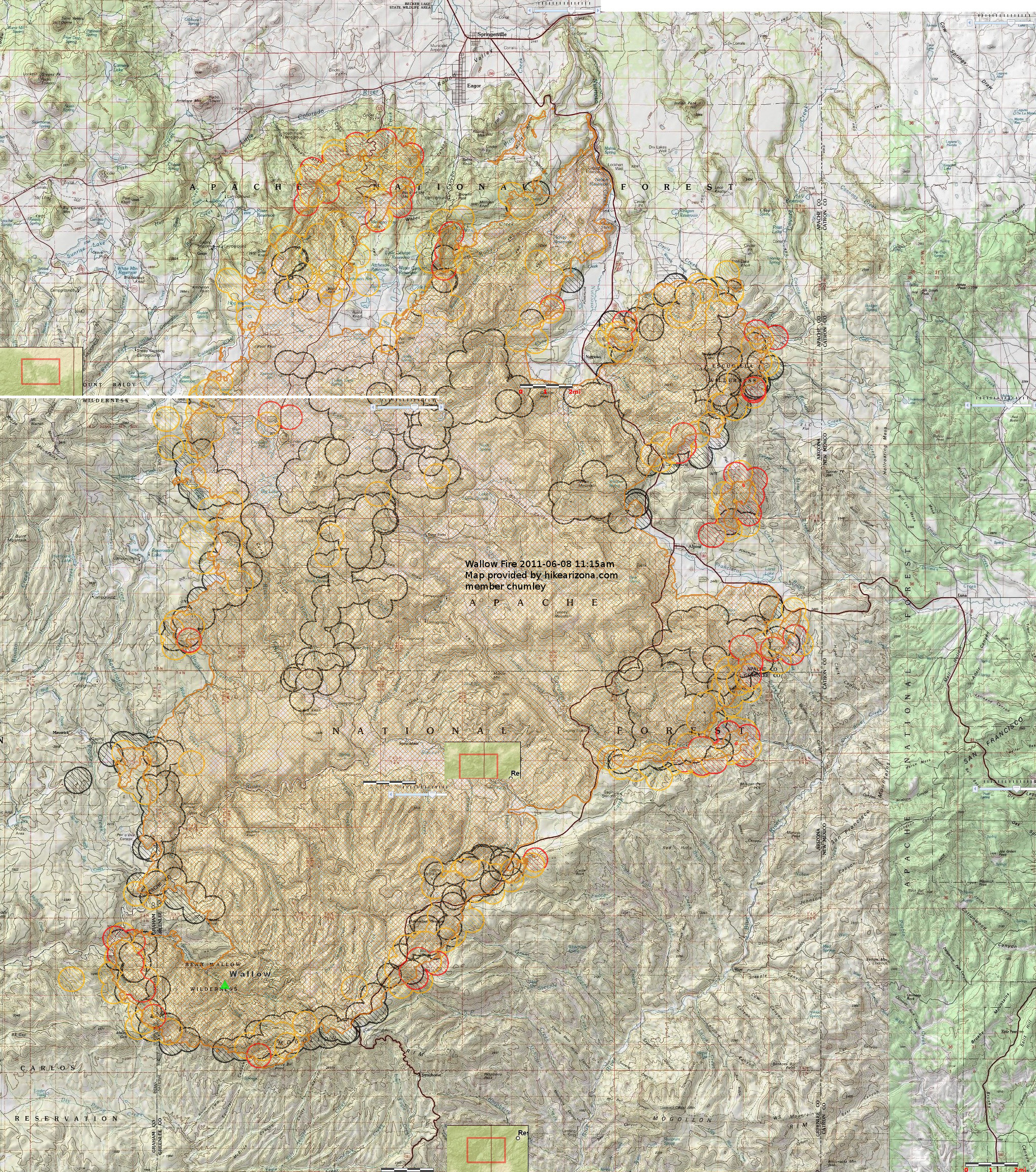 Here's the Modis map from 11:15 this morning (June 8th). I put it over a TOPO map so you could easily see locations. Looks like the perimeter is holding ok. Problem areas appear to be the entire southern line, east side of Escudilla, east side of Alpine, and north of Nutrioso.