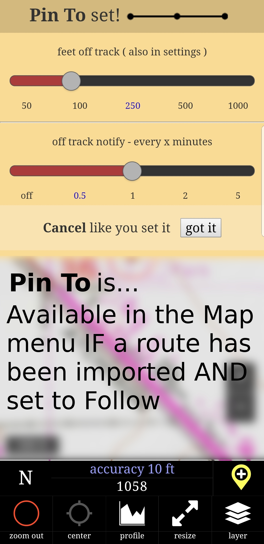 "Pin To"* is available under the Map menu IF a route has been imported AND set to Follow.