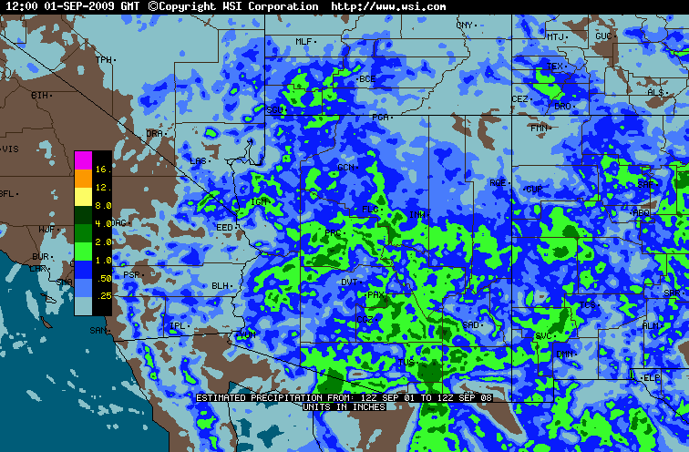Finally some "normal-ish" monsoon activity. The past few days have shown nice shower activity in the Yavapai County mountains, across the rim and into the White Mtns. Even a couple of nights with some storms popping up in the deserts. You know, the way it should happen through July and August! Hopefully we can keep this pattern going for a week or two until things dry out for autumn, typically around mid-September. Then we'll need a wet winter, which hopefully the el niño will provide.