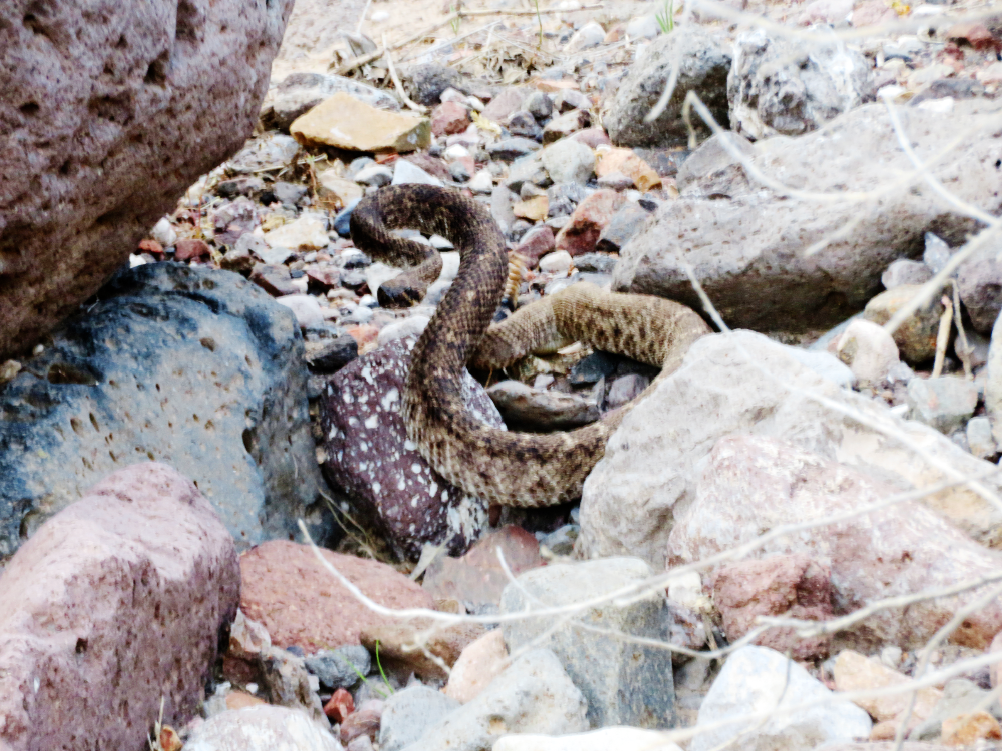 ANOTHER one along the Elephant Mountain trail yesterday –coiled, rattler buzzing (you can see it behind it's 'neck'), and ready to strike.