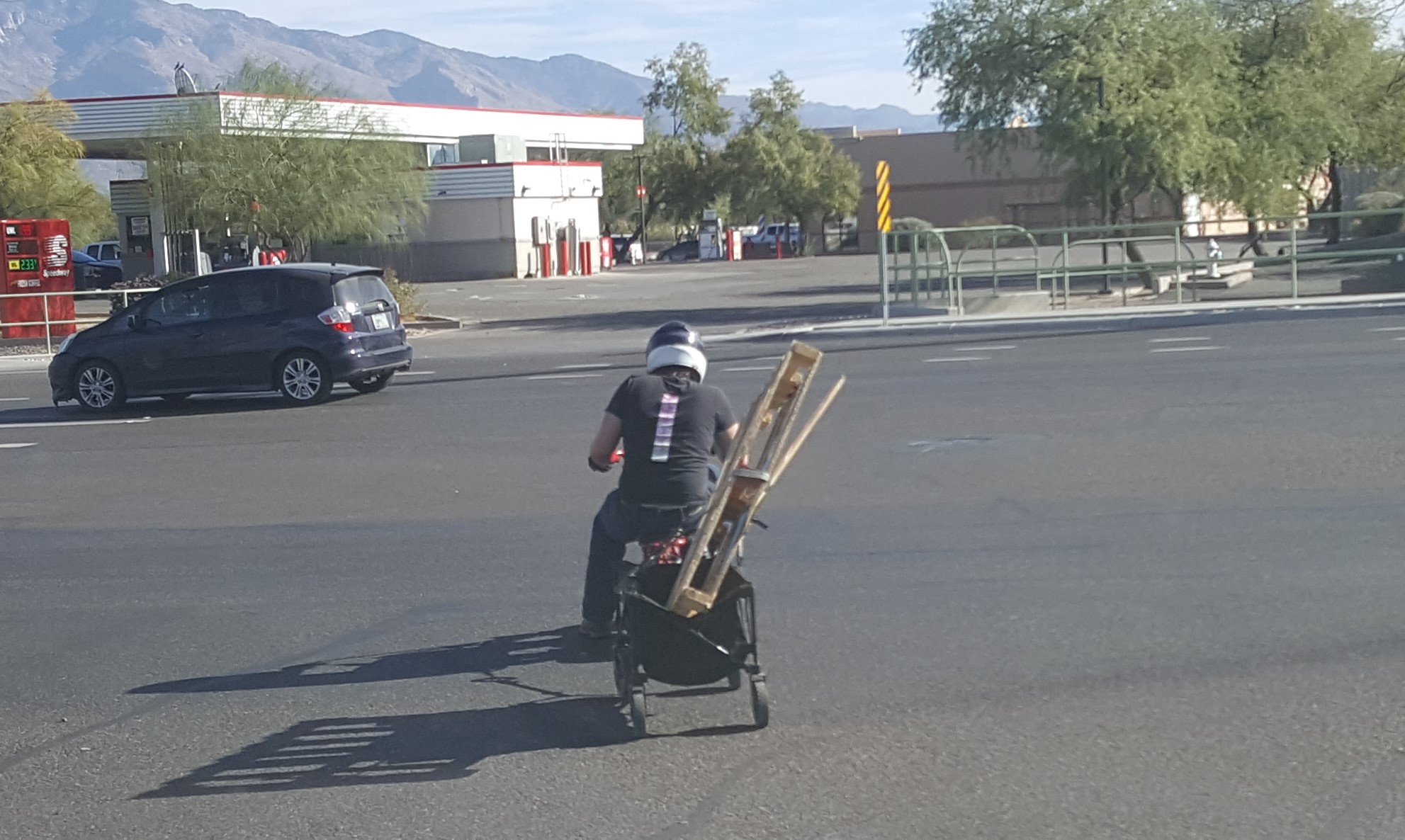 We have a lot of artistic types around Tucson, and this one was so creative as to hall his "masterpiece" around in a backward facing wheelchair, bungeed to a mini-bike.