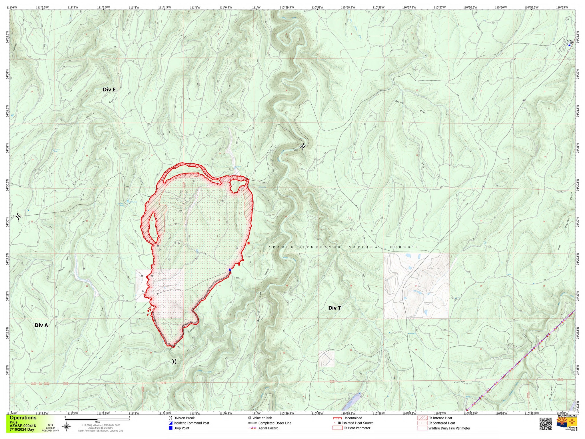 Pius managers just released a detailed map showing the perimeter. It is up to 1714 acres and 0% containment. Though the map shows a completed dozer line along a good portion of the south and southeast flank of the fire and the hottest areas burning along the north and northwest perimeters.