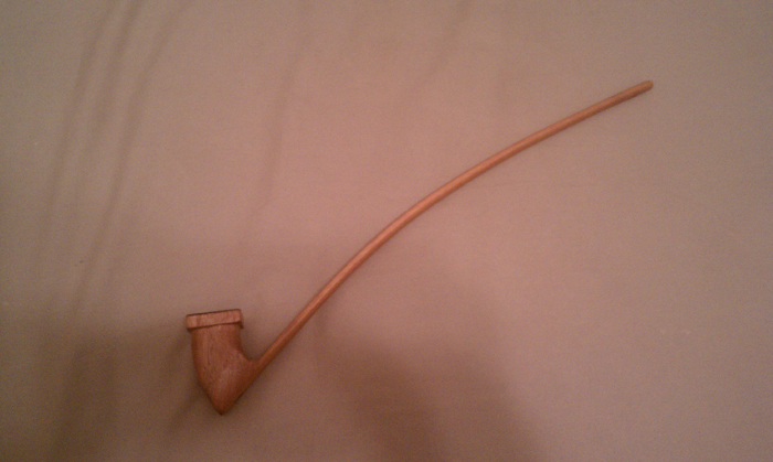 I hear everyone talking about smoking cigarettes, but no one has talked about pipe smoking. I have no objections to smoking a pipe on the road or on a break on the trail. In comparison with cigarettes, you aren't going to destroy your lung function by inhaling smoke since pipes are not meant to be inhaled. Plus, a nice English blend has a pleasant smoke that doesn't seem to irritate too many people because it smells nothing like cigarette smoke. Plus, I have a hand made smoking pipe that I'm sure most people would recognize the origins of. I've made a few of these, and gave some to friends. It's a nice cool smoke, no bite, and looks perfect for a long adventure. The stem is 16" long, and made of Spanish Cedar. The bowl is Liptus, vertical grain, and heats up enough that it makes a nice hand warmer on a cold night.