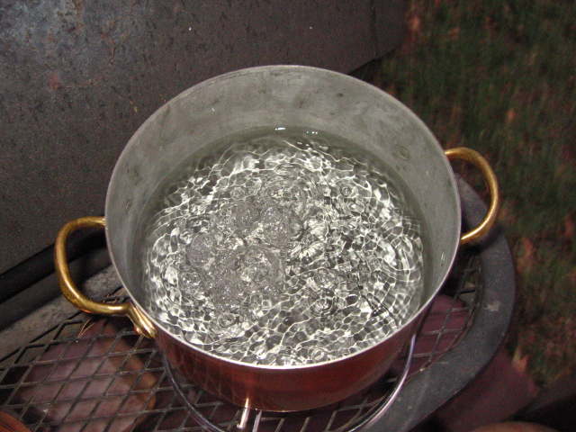 Update on my penny stove: I built a stand out of one of those beer can chicken roasters. It worked perfectly since it was meant to hold a 12oz. beverage can. I filled my 2qt. copper pot with 1qt. of tap water and it boiled in about 8 min. It kept a boil for about 10 min. I'm not sure exactly how much fuel I put in at the beginning, so controlled tests are on the agenda. My Next project is a wind screen to keep the heat where it belongs. I hope to cut down on the amount of time to come to a boil. I need to get an aluminum pot it will be much lighter in the pack also not as much mass to heat to achieve boil. I also need to come up with a way to change out stoves when one runs out of fuel. Needless to say they get pretty HOT.