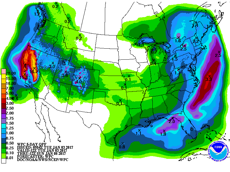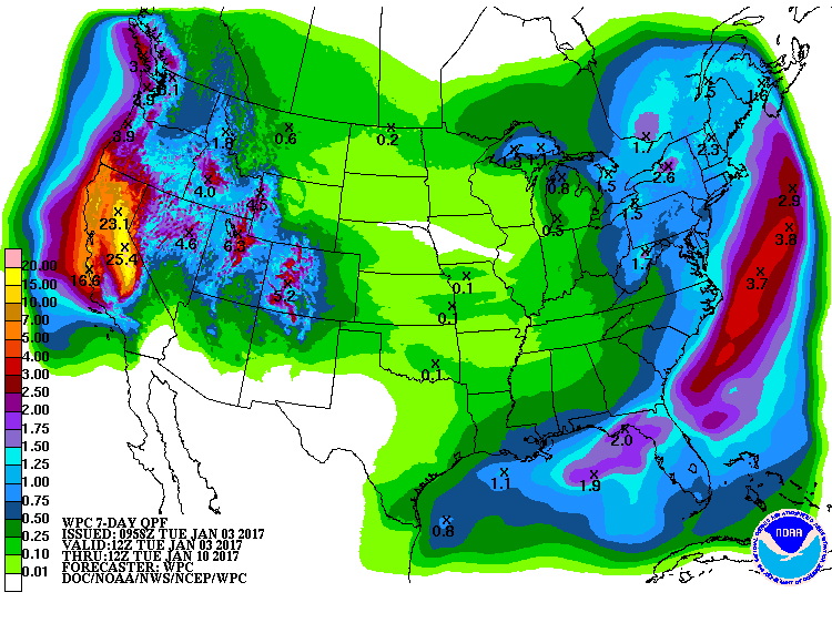 While Arizona sits under depressing overcast and cool maritime like conditions, California appears to be under an extremely wet pattern over the next 5 to 7 days. It will remain to be seen if 2 feet of liquid actually falls over the Sierra, but the forecast for such shows just how wet the next week there will be. Perhaps the models will dip some of that a bit further south and the Peaks will pick up another foot or so of new snow over 9,000'. Socal doesn't get much either. Time will tell. Wet for sure, and I'm glad I'm in Arizona. It just needs to be SUNNY!