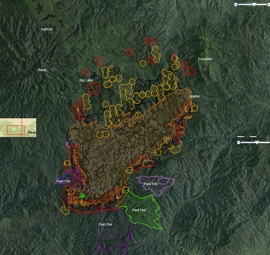 The Modis Satellite from 2:55 am this morning (Sunday June 5) shows a bit more. Note, the official perimeter has not been updated by the Type 1 team in charge, but clearly the fire has grown, including on the west side of Big Lake, and starting up Escudilla as Chazz said above. You can access the MODIS map at this website: