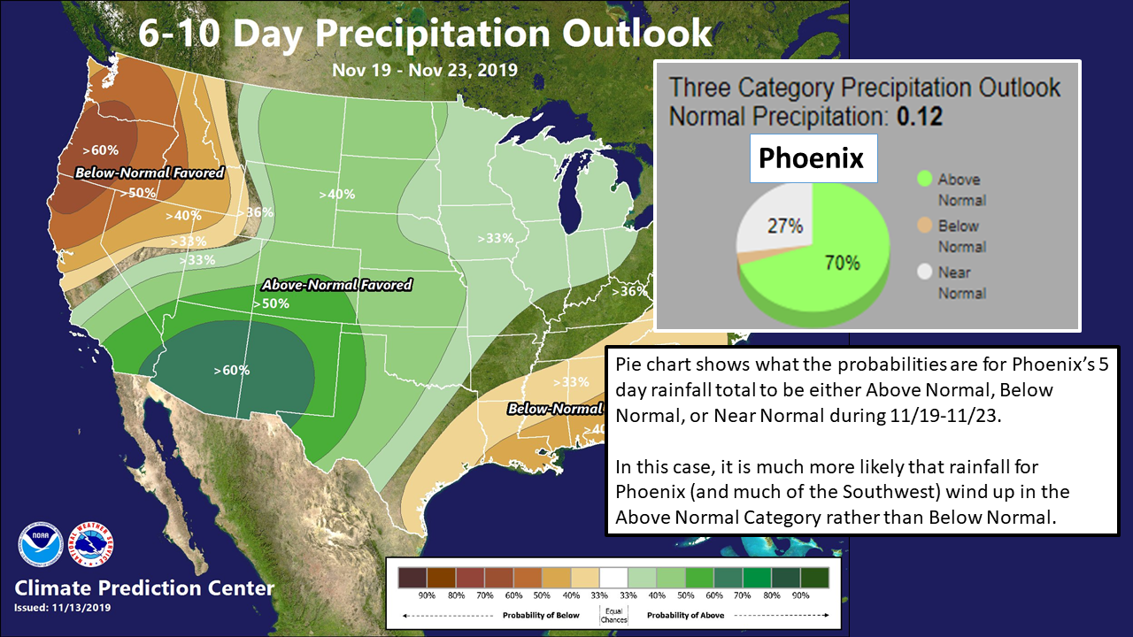 According to this graphic from the occasionally partially somewhat reasonably reliable National Weather Service, there is a 70% chance of more than the average 0.12" of rainfall during the 5-day period Tuesday-Saturday next week. There's only a 3% chance of less than that amount over the 5-day period.