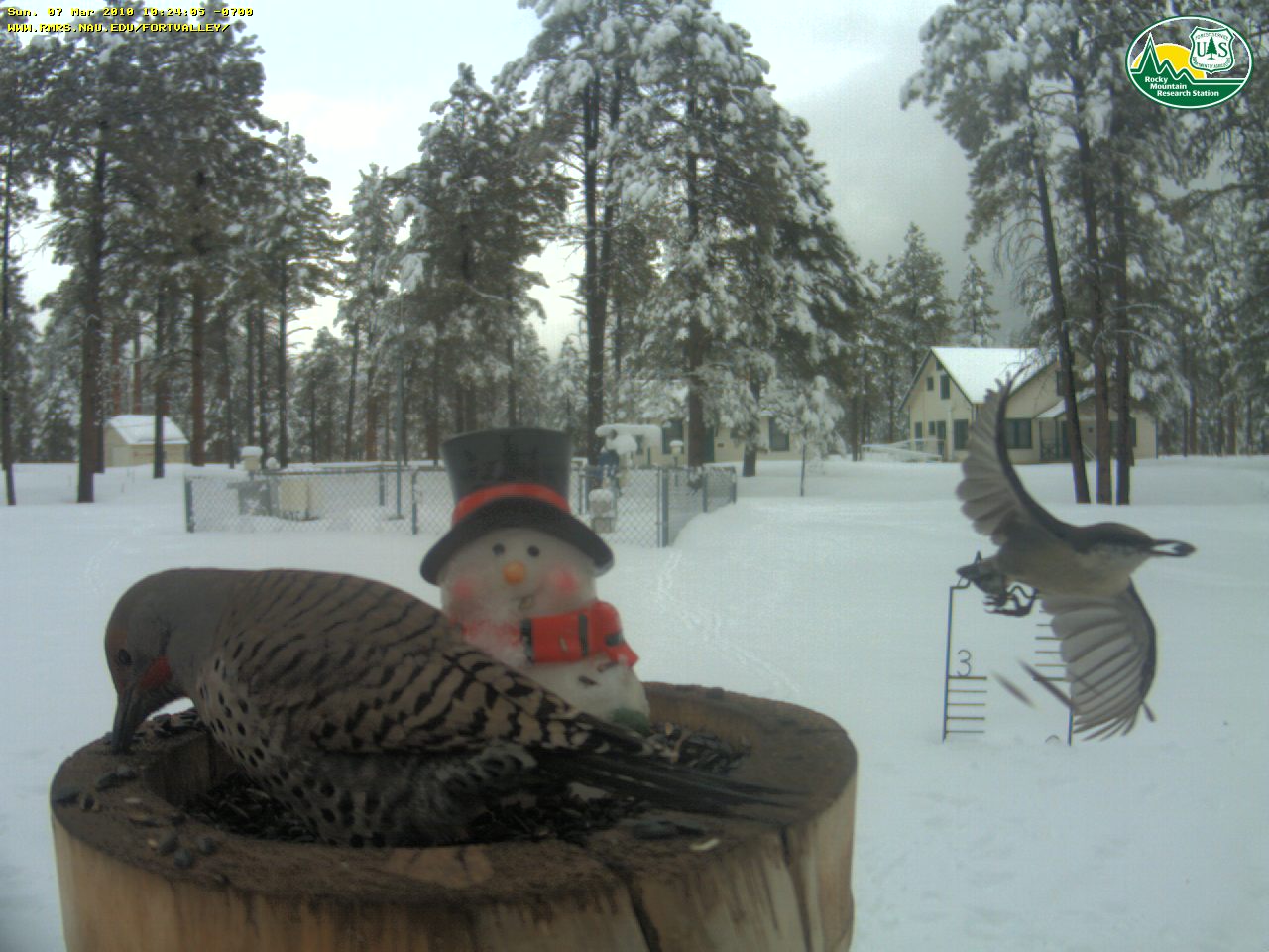 Great picture!!!chumley wrote:Only looks like a couple inches at Ft. Valley. But it does look pretty wet with how its caking the trees. I'm attaching the webcam picture because its a really cool timing shot with the bird just flying away with a fresh snack!