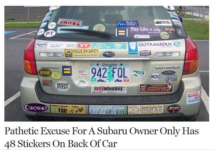 As a 10 year Subaru owner I'm still waiting for my "Coexist" sticker which I assumed came with the car.