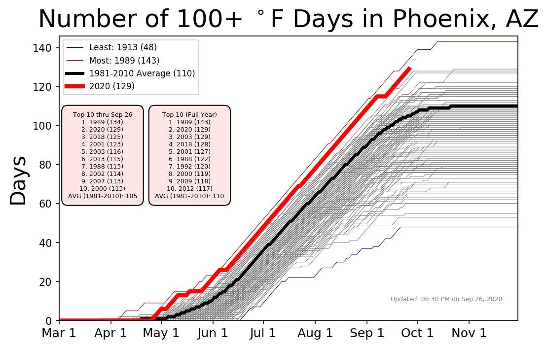 This graph is a couple of days old, but PHX is now up to 133 days over 100 degrees. The forecast for the next 7 days points toward hitting 140 by next Wednesday.