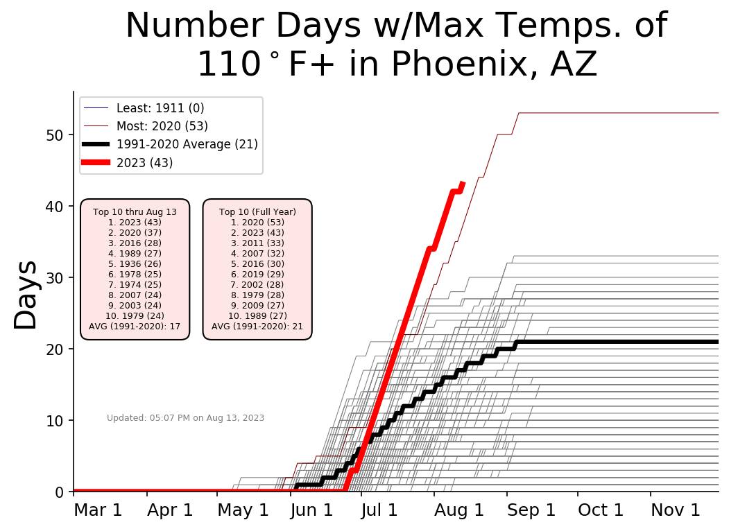 2023 will now result in PHX tallying the 3rd most days of 100F or higher. While it seems likely that we will add at least 3 more days over 100 based on current forecast models, we would need 12 more to reach the #2 spot. As neither of the two years with more 100s than this year had ANY 100s this late in the year, it seems to be a stretch that we could get 12 more. But I refuse to place bets on these things anymore.