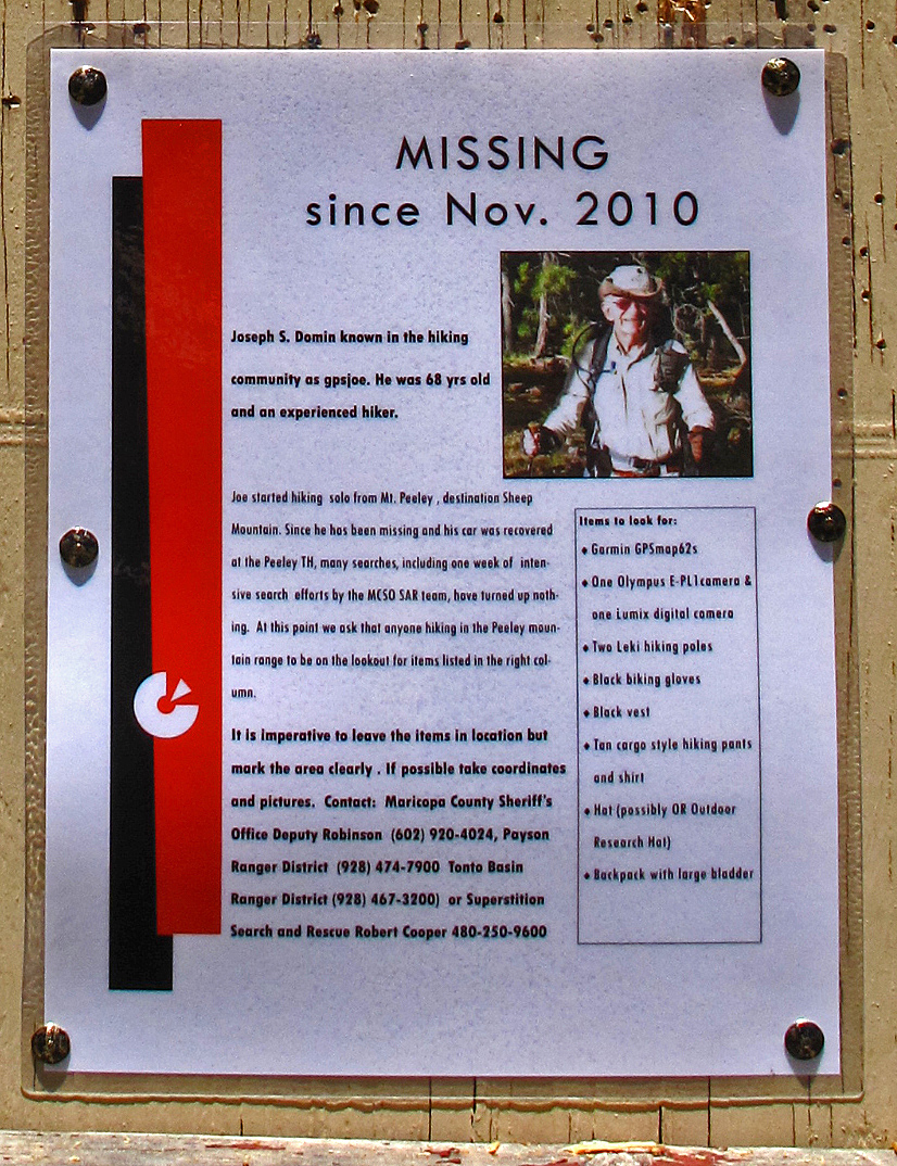 I hiked the Mt Peeley Summit trail on Saturday 8/27/2011 with a friend and saw the missing person flyer firmly attached to the notice board at the Peeley TH. It was laminated so it should be of use for some time. What I am about to write next is a bit hard to say, but in the interest of finding gpsjoe I will go ahead and say it, with the hope that nobody takes offense or finds it crude: We were standing on the summit of Mt Peeley looking toward Mt. Ord, and the wind was coming from that same direction (south east) and I caught the faint smell of something dead. I thought it was my imagination but my friend Jim had smelled it too. We decided to make a short search, so from there, I climbed down to a few small cliffs between 100 to 200 yards below the summit (sorry, no GPS track!) and made a loop across the SE face of the peak. I caught the smell twice more but it was not any stronger than before. The wind might have carried it a long way. This was at 10:00 am on 8/27/2011. I give this as a tiny piece of information that may possibly be useful in the overall search, with my apologies again to those who might find this hard to read.