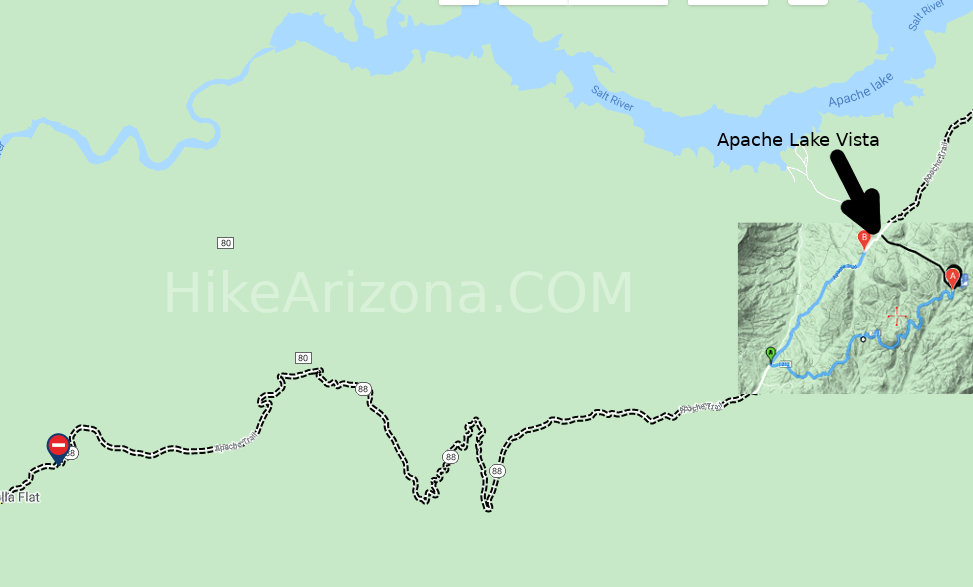 SR88(Apache Trail) closes just after FR79. From the Apache Lake Vista pullout it is a steady 0.85 mi / 900 ft off trail hike to the trailhead