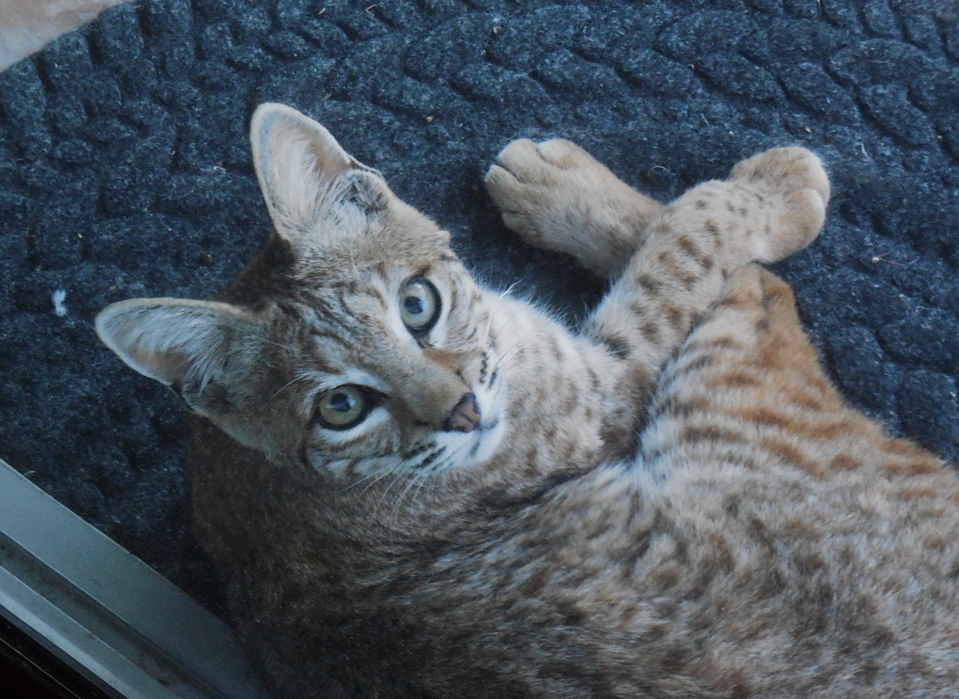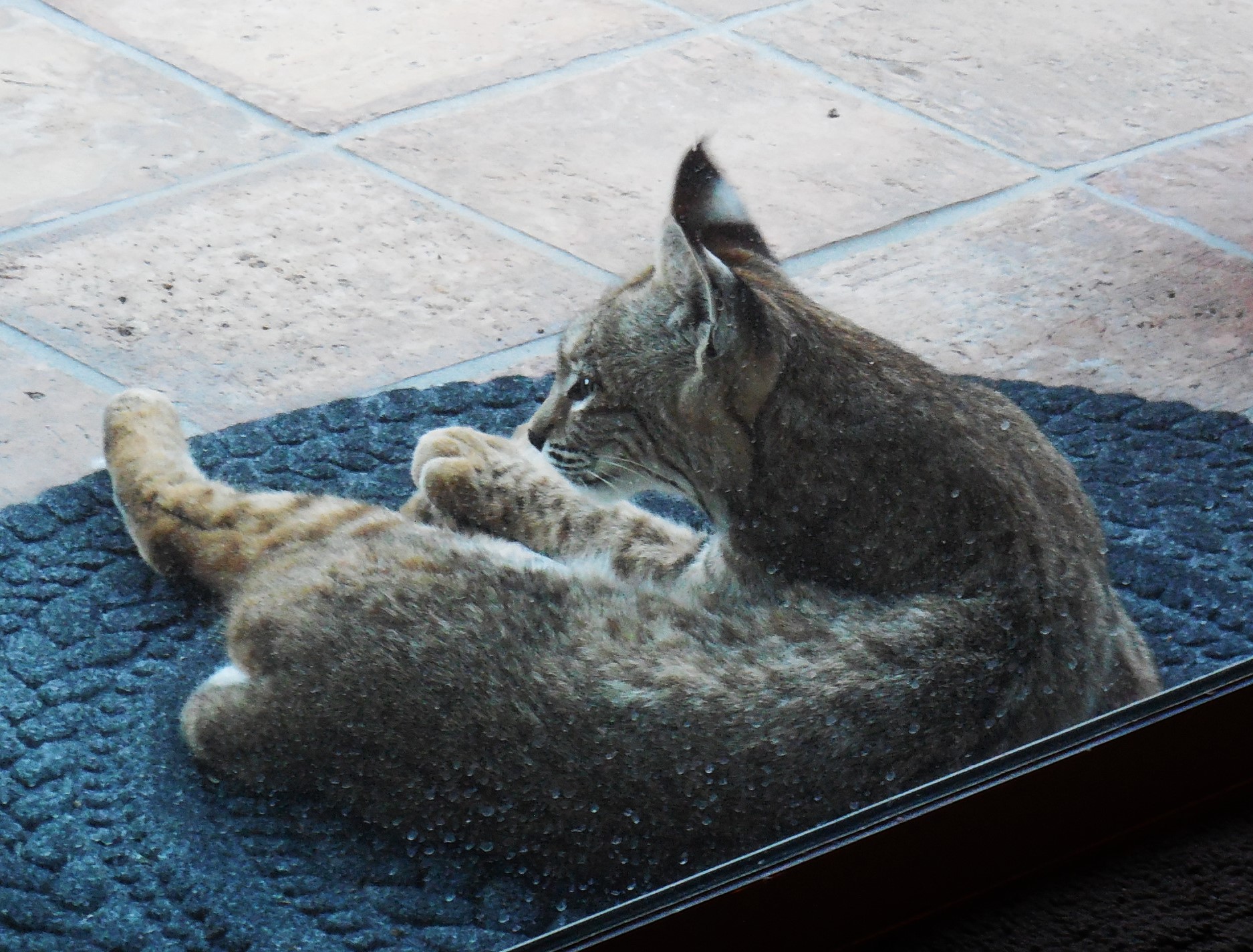 A Bobcat in my area had a litter of kittens and one of the juveniles came to my back door this afternoon for an extended visit. He napped and preened for at least half an hour after I noticed him before moseying off.