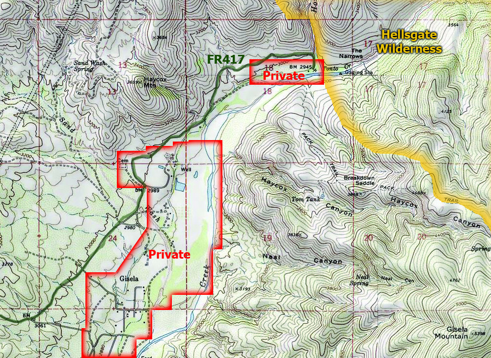 I don't recommend you get into an argument with a private land owner if you pass a sign that tells you not to, but I do believe that the access trail was always on private property, and was available to the public through the "generosity" of the land owner. There's a fair share of private land in the area, but also plenty of forest land and access. I can't get the GIS maps from Tonto NF right now to give you the absolute exact lines, but this is a pretty good showing of what you're dealing with. I note again however, the on-site survey that the homeowner has is better than most any map (including the one I include here), and its his land, so take his word for it and respect his privacy/property rights.