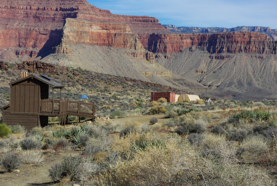 I just got back from a day hike, down the Bright Angel, across the Tonto, and exiting via the South Kaibab. They are heavily at work on the Kaibab today. A crew of 6 trail workers were doing footpath repair on the section between Skeleton Point and the junction of the Tonto, specifically in the steep switchback section where it drops through the Redwall. Also, the crew is living in a couple of industrial size tents with a huge equipment container that is set up at the Tonto junction, some distance behind the outhouse. Here is a shot of the camp. I had to get it from a distance because (a) they had a sign requesting hikers to keep out and (b) I was too lazy to walk any closer. :sweat: