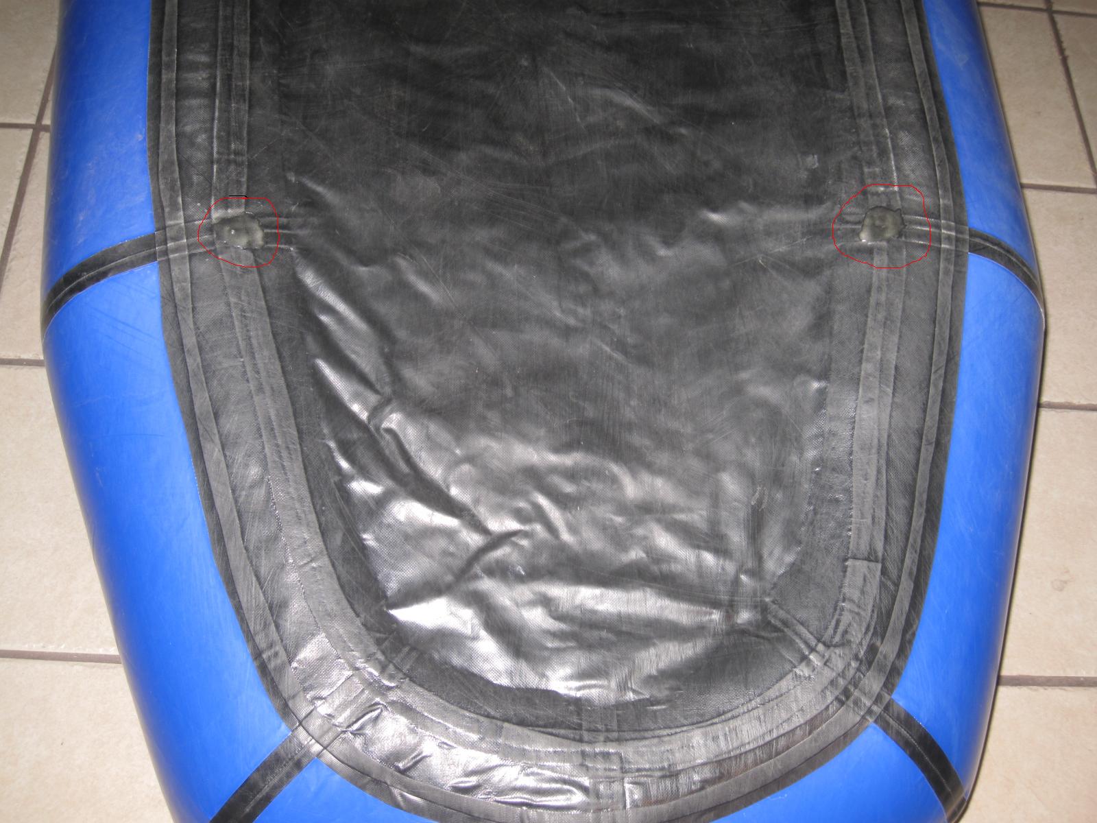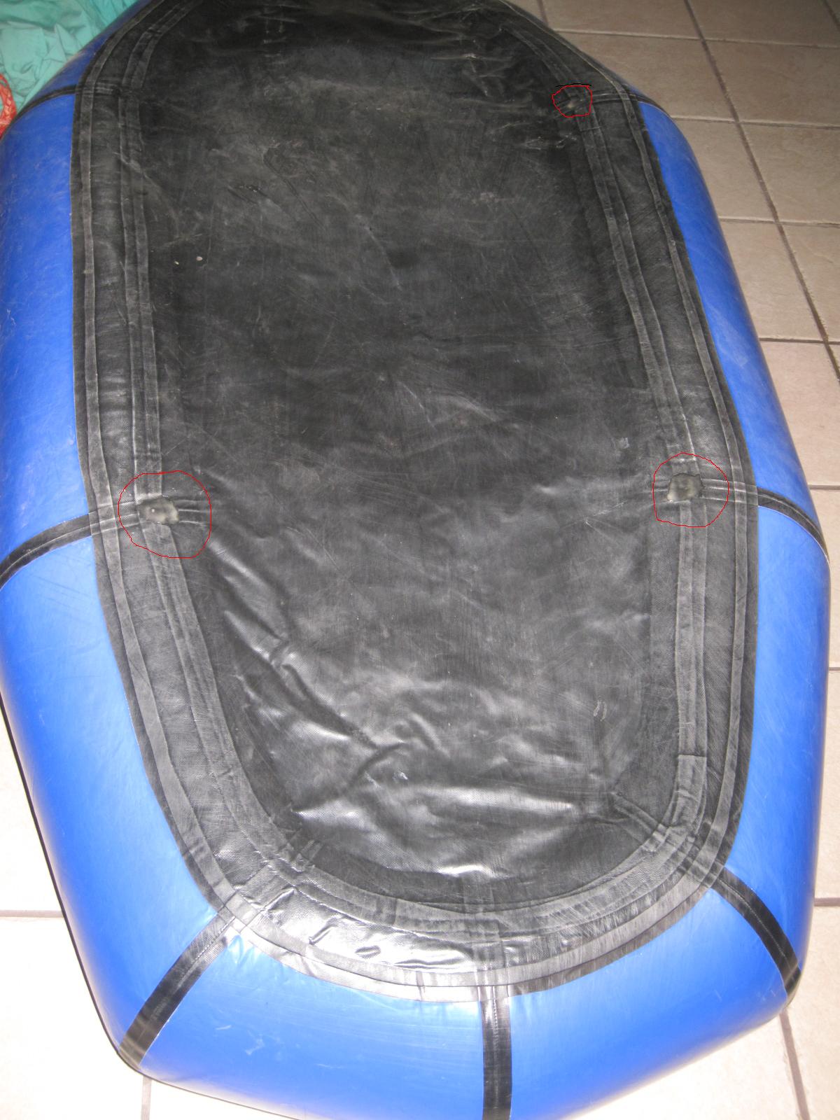 I should also add that I added 3 additional tie down points. 2 near the stern of the boat to create a full rail, and 1 on the inside of the left tube to use to clip stuff onto it. Took more pics, small red circles are the places I added aquaseal. Green bag sitting on top of spray deck is the inflation bag.