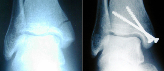 Two screws in the right ankle after a freak rockclimbing incident at age 38. A week on the couch, no weight on it at all for a month, very gradual use after that, 6 months for full recovery. I first started putting weight back on it while in a swimming pool in chest-deep water, the buoyancy helped keep the stress low. Patience is the key, you'll need that ankle for the rest of your life!