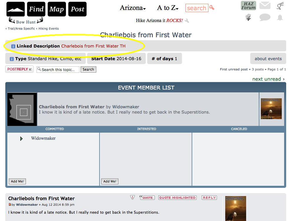 Hi There ..did you complete the hike at charlebois today? The calendar shows you went with my husband, Widowmaker....He is not home yet, so I am checking all angles....Please call me if you have any news or information. I have called 911 pinal co sheriff. Thanks,