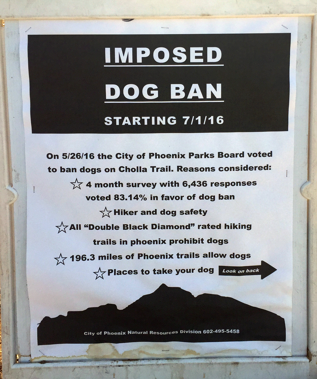 It's official. Dogs will be permanently banned beginning July 1 on the Cholla Trail. Echo Canyon Trail has banned dogs for several years.