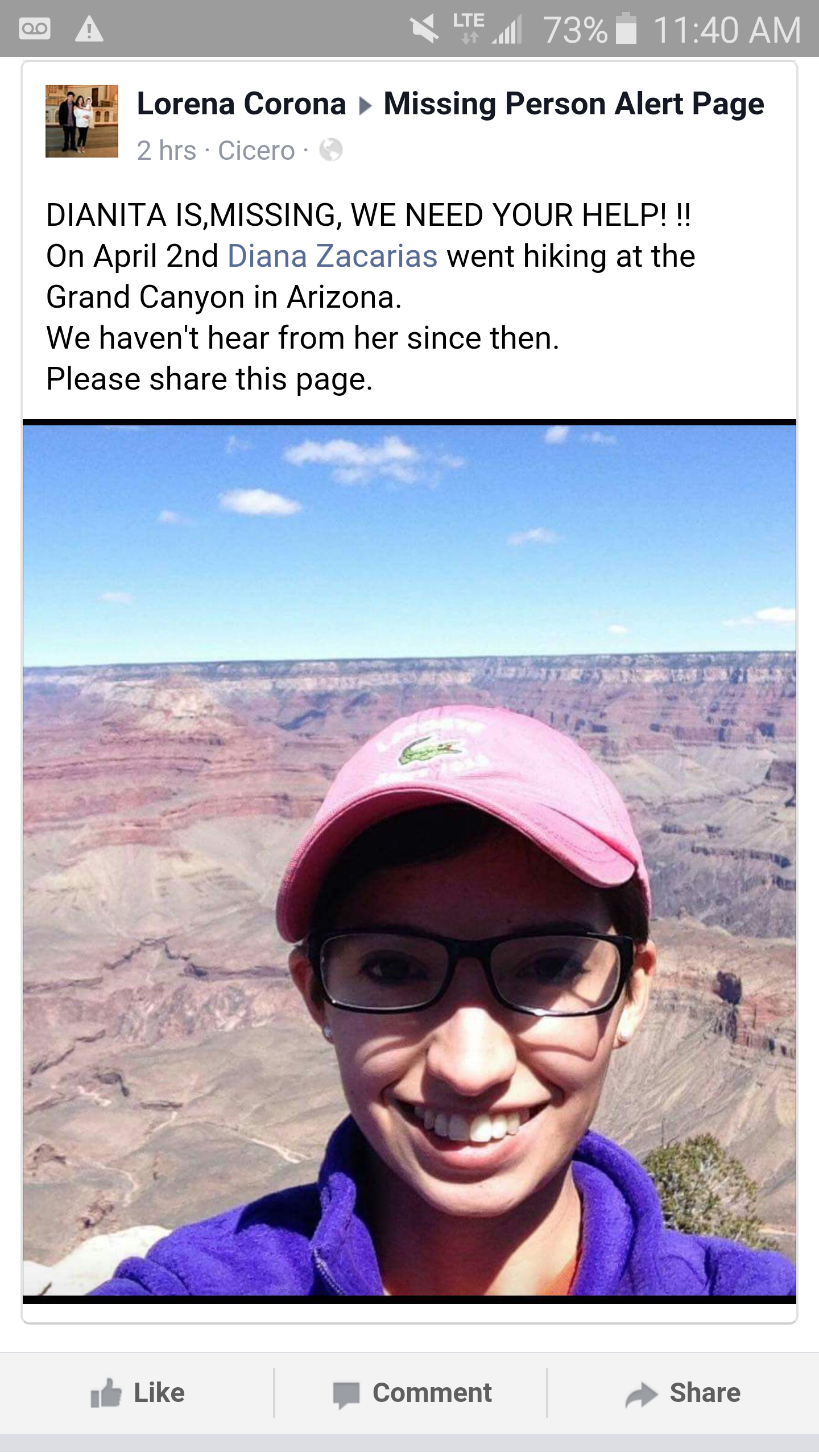 If you're hiking in the grand canyon area, please be on the look out for Diana Zacarias, she missed her flight and we have not had any contact with her since. She is female about 5'5 brown short hair, skinny. her phone might be dead so may need assistance.