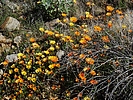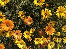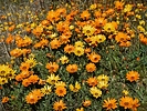 Habitat: Roadsides, arid regions, open fields and rock gardens. Flowers: Early spring. Description: A hardy, spreading annual with daisy-like flowers. A native of South Africa, it has naturalized throughout the southwestern United States. Blooms are 2-4 inches across in brilliant shades of white, yellow, and orange. The genus name, Dimorphotheca, means "two shapes of seed" relating to the fact that the plant produces two non-identical seed forms. Another genus Arctotis sp is also referred to as an African Daisy. |