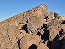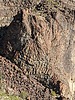 By definition, basalt is an aphanitic igneous rock with less than 20% quartz and less than 10% feldspathoid by volume, and where at least 65% of the feldspar is in the form of plagioclase. Basalt features a glassy matrix interspersed with minerals. The average density is 3.0 gm/cm3. Basalt is defined by its mineral content and texture, and physical descriptions without mineralogical context may be unreliable in some circumstances. Basalt is usually grey to black in colour, but rapidly weathers to brown or rust-red due to oxidation of its mafic (iron-rich) minerals into rust. Although usually characterized as "dark", basaltic rocks exhibit a wide range of shading due to regional geochemical processes. Due to weathering or high concentrations of plagioclase, some basalts are quite light coloured, superficially resembling rhyolite to untrained eyes. Basalt has a fine-grained mineral texture due to the molten rock cooling too quickly for large mineral crystals to grow, although it is often porphyritic, containing the larger crystals formed prior to the extrusion that brought the lava to the surface, embedded in a finer-grained matrix. Basalt with a vesicular or frothy texture is called scoria, and forms when dissolved gases are forced out of solution and form vesicles as the lava decompresses as it reaches the surface. The term basalt is at times applied to shallow intrusive rocks with a composition typical of basalt, but rocks of this composition with a phaneritic (coarse) groundmass are generally referred to as diabase (also called dolerite) or gabbro. Columnar basalt at Szent György Hill, Hungary Vesicular basalt at Sunset Crater, Arizona. US quarter for scale. In the Hadean and Archean (and the early Precambrian) eras of Earth's history the chemistry of erupted basalts was significantly different from today's, due to crustal and asthenosphere differentiation issues—so much so that there is an alternate (but less well known) name for this kind of basalt. Source: wikipedia |